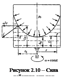 Другим случаем относительного покоя жидкости является вращение сосуда с постоянной угловой скоростью ω (рисунок 2.10). При вращении на каждую частицу жидкости единичной массы, расположенную на радиусе r, также действуют две силы: сила тяжести g и сила инерции, вызванная центробежным ускорением, а = ω2 r. Равнодействующая этих двух сил