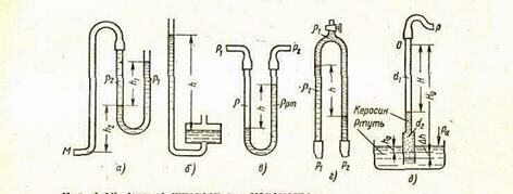 г) двух-жидкостный микроманометр; д) двух-жидкостный чашечный манометр.