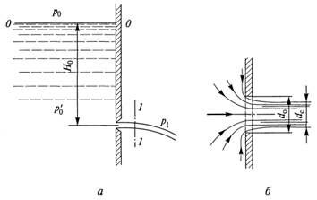 Рассмотрим истечение жидкости через отверстие диаметром d0 в стенке бака, расположенное на глубине Н0, в газовую среду с некоторым давлением р1 (рисунок 4.1, a). При этом предполагается, что если отверстие мало по сравнению с размерами бака и глубиной Н0, то другие стенки бака и свободная поверхность жидкости не влияют на приток жидкости к отверстию.