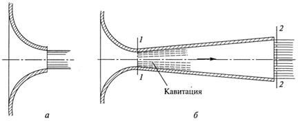 Диффузорный насадок (рисунок 4.4, б) представляет собой комбинацию сопла и диффузора. Установка диффузора с оптимальным углом на выходе позволяет, не меняя проходного сечения отверстия (сечение 1-1) и расчетного напора, повысить расход жидкости почти в 2,5 раза по сравнению с расходом через сопло. Недостатком диффузорного насадка является склонность его к возникновению кавитации в узком сечении 1-1.
