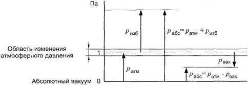 Избыточным давлением Ризб называют превышение значением абсолютного давления воздуха значения атмосферного давления. Недостаток абсолютного давления относительно атмосферного называют вакууметрическим давлением или просто вакуумом Рвак (рис. 2.2).
