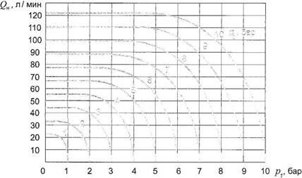 Приведенные характеристики показывают, что при перепаде давления Ар = 0,1 МПа (1 бар) и начальном давлении сжатого воздухаро= 1 МПа (10 бар) расход QH при технических нормальных условиях через диафрагму составляет 70 л/мин, а при таком же значении Ар мро= 0,5 МПа (5 бар) — всего 50 л/мин.