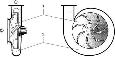 В центробежных компрессорах (турбокомпрессорах) основным элементом конструкции служат расположенное в спиральном отводе 2 рабочее колесо 1, представляющее собой диск со специально спрофилированными лопатками (рис. 3.10).