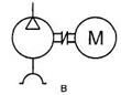 Изображение простейшей компрессорной установки, состоящей из компрессора, воздухозаборника на линии всасывания, приводного электродвигателя и соединительной муфты, принимает, таким образом, следующий вид (рис. 3.12, в).