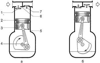 При движении поршня к нижней «мертвой точке» (обратный ход — рис. 3.3, а) рабочая камера компрессора, образованная замкнутым объемом между поршнем 3 и крышкой 6 цилиндра, увеличивается и в ней создается вакуум. Под действием атмосферного давления открывается всасывающий клапан 1, через который в цилиндр поступает воздух. В это время нагнетательный клапан 7 удерживается в закрытом положении под действием вакуума в рабочей камере и высокого давления в нагнетательном трубопроводе. После достижения поршнем 3 крайнего положения начинается процесс его движения к верхней «мертвой точке» (прямой ход— рис. 3.3, б). Объем рабочей камеры начинает уменьшаться, давление в ней возрастает, и всасывающий клапан закрывается. Нагнетательный клапан открывается тогда, когда давление в цилиндре превысит давление в линии нагнетания. Полный цикл такого компрессора совершается за два хода поршня — обратный и прямой, т. е. за один оборот приводного вала.