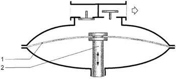 В мембранном компрессоре процесс получения сжатого воздуха происходит в принципе так же, как и в поршневом, стой лишь разницей, что в нем подвижной поршень заменен жестко закрепленной гибкой мембраной 1. Замкнутый объем изменяется за счет деформации мембраны при возвратно-поступательном движении штока 2.
