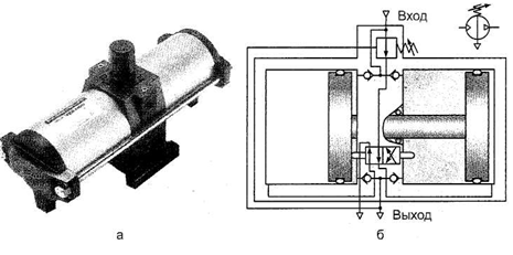 Усилитель давления фактически представляет собой двухпоршневой компрессор с пневматическим приво­дом. Поршни перемещаются под действием сжатого воздуха, поступающего поочередно в одну из приводных (бесштоковых) камер. Реверсирование движения поршней осуществляется при достижении ими «мертвых то­чек» посредством встроенного 4/2-пневмораспределителя с двусторонним механическим управлением. Уровень давления на выходе задается с помощью регулятора давления и контролируется через канал обратной связи.