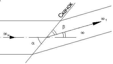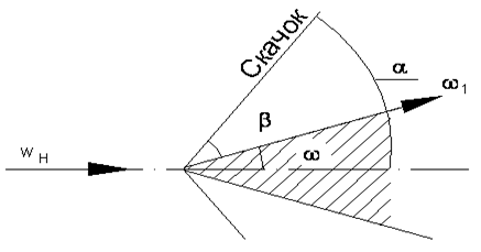 Зная соотношение плоскостей, можно вычислить угол ω, на который отклоняется поток в скачке:
