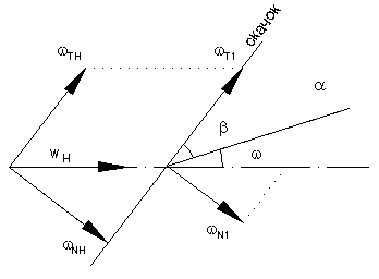 Разложим векторы скорости до скачка wН и после скачка w1 на составляющие параллельно фронту и нормально фронту ударной волны (скачка). При этом тангенциальная составляющая остаётся постоянной wt=const, а нормальная составляющая уменьшается wNH > wN1.