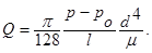 - закон Пуазейля (расход жидкости Q при истечении через трубку длиной l, диаметром d при избыточном давлении p-p0 :