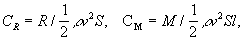 Аэродинамические коэффициенты силы CR находят как отношение аэродинамической силы R к скоростному напору ρv2/2 и характерной площади S, а эродинамические коэффициенты момента CМ - как отношение аэродинамического момента М к ρv2/2, S и к характерной длине l , т. е.