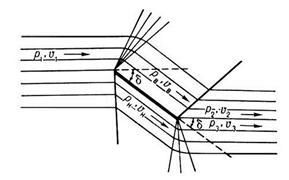 При сверхзвуковых скоростях характер обтекания существенно меняется. Так, при обтекании плоской пластины у передней кромки на верхней поверхности образуются волны разрежения, а на нижней - ударная волна (рис. 3).
