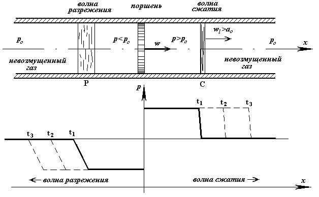За поршнем, слева возникает и распространяется влево волна разрежения P и наблюдается противоположная картина: волны разрежения "размываются" со временем, т. к. за ее фронтом возмущения распространяются в разреженном охлажденном газе со скоростью меньшей, чем ао. Поэтому "ударных волн разрежения" быть не может.