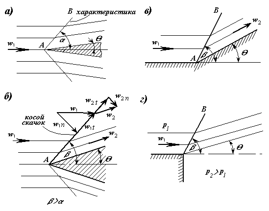 Кроме случая обтекания клина, косой скачок наблюдается при обтекании внутреннего тупого угла a (рисунок 4 в), когда сверхзвуковой поток, текущий вдоль плоской стенки, поворачивает вместе с ней на угол q. Косой скачок появляется также при сверхзвуковых истечениях газа в среду с повышенным противодавлением (рисунок 10.4 г) (например, при истечении из сопла Лаваля на нерасчетных режимах). В этом случае q определяется отношением давлений р2/р1 > 1.