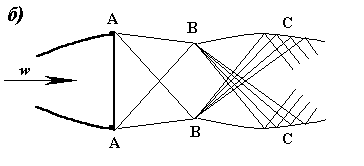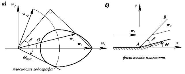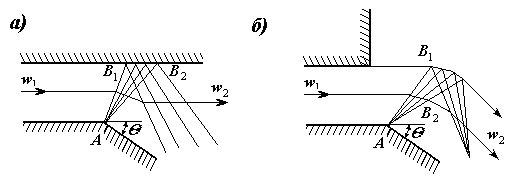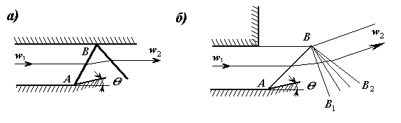 Возникновение косых скачков наблюдается, например, при обтекании сверхзвуковым потоком (w1>a; M1 > 1) острого клина (рисунок 10.4 а) с очень малым углом раствора q, когда возмущение потока весьма невелико и угол a характеристики АВ может быть определен по формуле для характеристик
