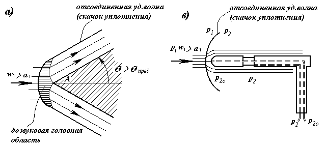 Если газовый поток набегает со сверхзвуковой скоростью на затупленное спереди тело, то при торможении он нагревается, так что его скорость падает, а местная скорость звука возрастает. В результате перед телом возникает некоторая область дозвуковых скоростей сжатого нагретого газа.