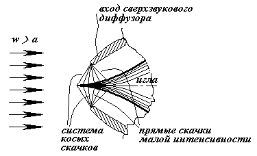 Рисунок 10. 9 - Вход в камеру реактивного двигателя с "иглой", разбивающей головную ударную волну на систему конических скачков