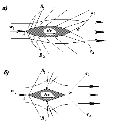 Рисунок 10.11 - Обтекание чечевицеобразного (а) и ромбовидного (б) крыльев