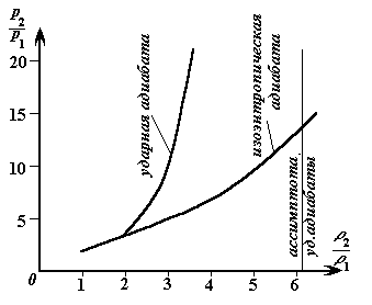Это уравнение Гюганио представляет так называемую ударную адиабату, или адиабату Гюганио, связывающую отношения давлений и плотностей после и до скачка уплотнения, рисунок 10.3.