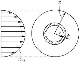 Вычислим поток жидкости Q, т.е. объём жидкости, протекающей через поперечное сечение трубы в единицу времени. Через кольцо радиуса