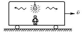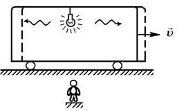 | Пусть имеется движущий вагон с лампочкой посередине него. В некоторый момент лампочка вспыхивает. Если наблюдатель находится в вагоне, то относительно него свет достигает задней и передней стенки вагона одновременно (Рис. 6.2 а). Если же наблюдатель находится вне вагона. То относительно него свет достигает задней стенки быстрее, чем передней (Рис. 6.2 б). Мысленный эксперимент демонстрирует относительность понятия одновременности. |