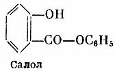 Салол (Salolum), ФVIII. Белый кристаллический порошок, почти нерасторимый в воде. Назначают внутрь по 0,3—0,5 г 2—3 раза в день при неспецифических инфекционных заболеваниях кишечника.