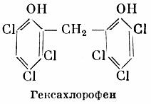 Хлорзамещенные и некоторые другие производные фенола обладают сильным противомикробным действием, часто значительно превосходящим по активности карболовую кислоту. Среди производных фенола следует назвать гексахлорофен (2,2'-диокси-3, 5, 6, 3', 5', 6'-гексахлордифенилметан), обладающий высокой бактерицидной активностью и не оказывающий раздражающего действия на кожу. Гексахлорофен употребляют для изготовления дезинфицирующего мыла, применяемого для мытья рук.