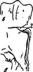 а-вывих подвздошво-крестцового сочленения, б — нормальное положение крестцовой кости, в — сопоставление крестца; 1 — в норме, 2 — при вывихе.