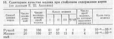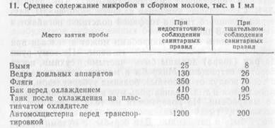 Источником загрязнения молока могут быть также посуда, доильная аппаратура. Поэтому доильные аппараты, используемую посуду, фильтры надо содержать в чистоте. При машинном доении молоко поступает в закрытую систему, что предупреждает попадание в него микробов извне. Однако плохая организация машинного доения приводит к ухудшению санитарного состояния молока. При этом число микробов по сравнению с ручным доением возрастает в 4—5 раз, а иногда и более. Показатели санитарного качества молока приведены в табл. I.