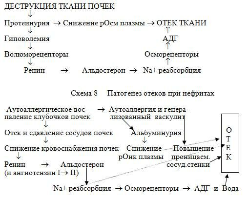 А) Нефротический: деструкция ткани почки (гломерулосклероз, сахарный диабет, амилоидоз, интоксикации, аутоиммунная патология) – резкая протеинурия (нефротический синдром) – снижение рОнк плазмы с отеком ткани + гиповолемия с повышением ренин-альдостерона – Na+ - АДГ – вода. Механизм: онкотический и затем осмотический. Присоединяется и лимфо-венозная недостаточность.