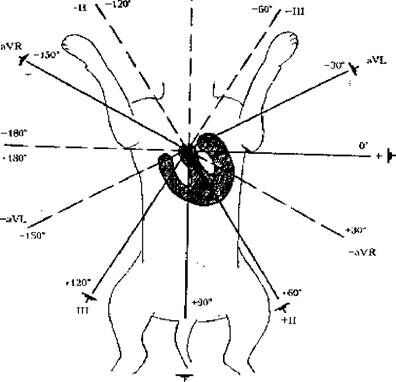 Если совместить оси трех стандартных и трех усиленных отведении от конечностей, проведенные через электрический центр сердца, получим шестиосевую систему координат, предложенную в 1943 г. Бейли, в которой оси смежных отведении разделяются углами в 30°. Электрический центр делит ось каждого отведения на положительный (обращенный к активному электроду) и отрицательный отрезки.