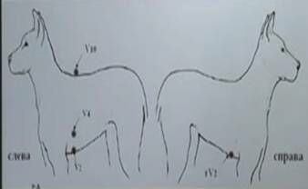 У собак снимают 10 отведении ЭКГ: 6 отведении от конечностей — 3 стандартных и 3 усиленных, и 4 грудных отведения.
