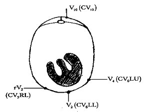 | CV5RL (rV2)— в правом пятом межреберном промежутке около края грудины, т. е. над правым желудочком; СV6LL (V2) — в левом шестом межреберном промежутке около края грудины, т. е. над межжелудочковой перегородкой; СV6LU (V4) — в левом шестом межреберном промежутке на ребернохрящевом соединении, т. е. над верхушкой сердца; СV10 (V10 )— над остистым отростком седьмого грудного позвонка, т.е. над боковой стенкой левого желудочка. |
