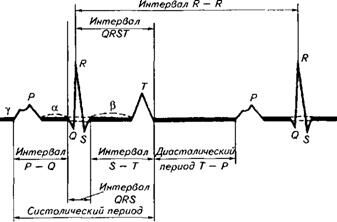 Интервал R—R или Р—Р соответствует времени одного сердечного цикла. Длительность этого интервала определяется от вершины одного зубца R. до вершины следующего зубца R или начала зубца Р до начала следующего зубца Р сердечного цикла.