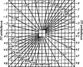 Таблица представляет собой сетку; на верхней и нижней линиях откладывают амплитуды комплекса QRS в I и III отведениях. Предварительно вычисляют алгебраическую сумму амплитуд зубцов комплекса QRS в мм. Затем полученные величины откладывают на соответствующие стороны таблицы: при этом от 0° вправо — амплитуды с положительным знаком, а от 0° влево — с отрицательным.