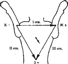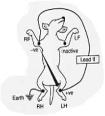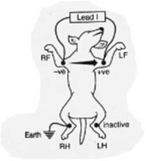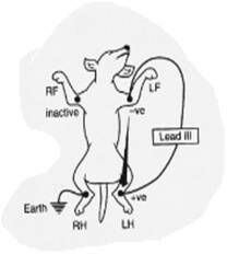 | I отведение — левая (+) и правая (-) передние конечности; | II отведение — левая задняя (+) и правая передняя (-) конечности; | III отведение — левая задняя (+) и левая передняя (-) конечности. |