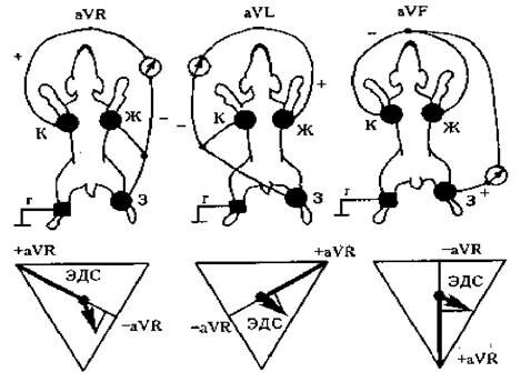 Оси усиленных однополюсных отведении от конечностей получают, соединяя электрический центр сердца с местом наложения активного электрода данного отведения, т. е. с одной из вершин треугольника Эйнтховена.