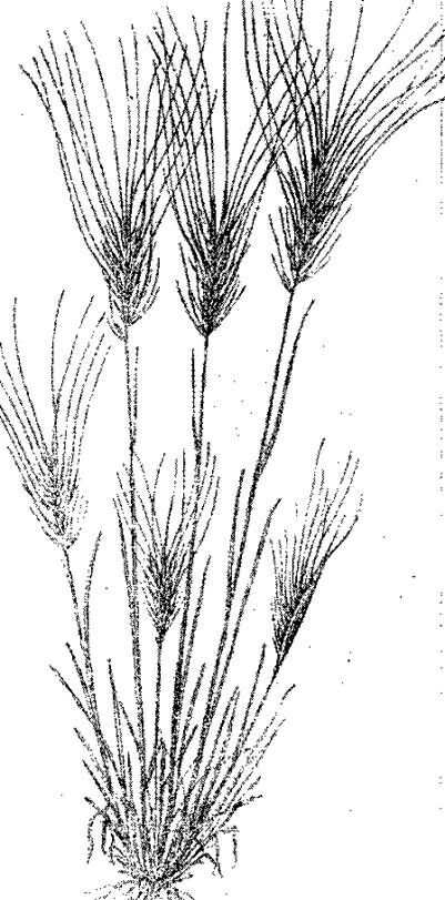 Триостница перися (AristidapennataTrin.). Растет дерновинками. Стебель высотой 30-40 см, ветвистый, листья узкие щетиновидно- или шиловидно-свернутые; колоски узкие; зерновка с трехраздельной остью, до самого верха перисто-опушенная, длиной 1—1,5 см (рис. 2).