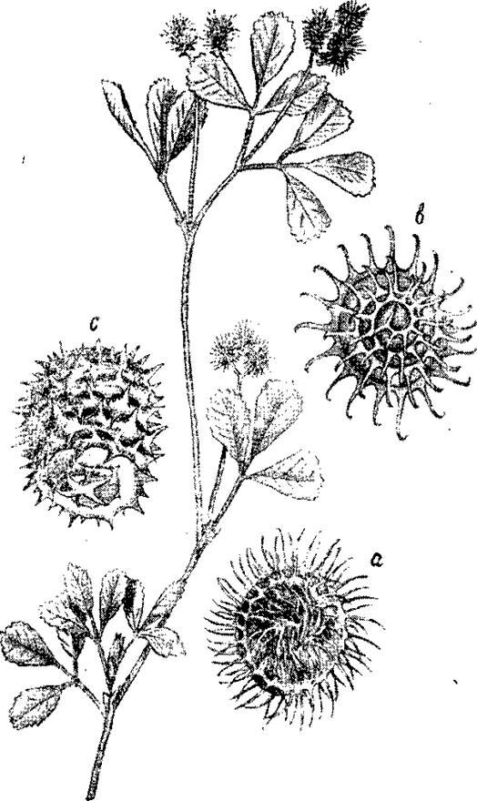 Злостными засорителями овечьей шерсти, причиняющими в то же время большое беспокойство животным, могут быть цепкие семена некоторых видов люцерны (рис. 193), особенно снабженные загнутыми шипиками семена люцерны зубчатой (Medicagodenticulate), в меньшей степени — люцерны м а л е н ь к о й (М. minimaGrufberg), люцерны жестковатой.