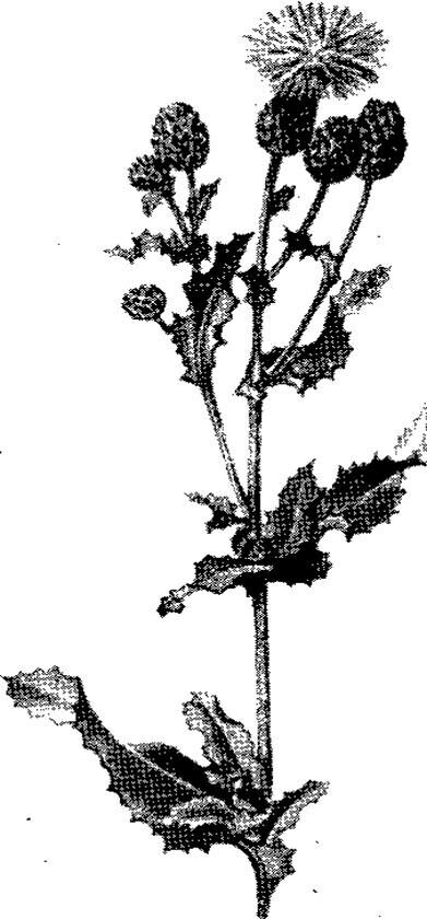 Бодякполевой (Cirsium arvense Scop.). Многолетнее растение. Стебель жесткий, ветвистый; листья очередные, продолговато-ланцетные, сидячие, к основанию суженные, немного нисбегающие, по краю реснитчато-острошиповатые; соцветие—корзинка, состоящая из однополых мужских или женских цветков; цветки сиренево-лиловые; листочки обертки оканчиваются колючкой; плод — семянка, снабженная летучкой, состоящей из длинных перистых волосков.