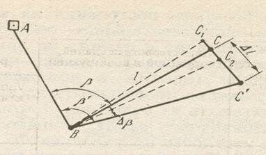которую необходимо ввести для уточнения построенного угла. Зная проектное расстояние ВС = l, вычисляют линейную поправку СС' = Δl. Из геометрии построений (рисунок 1) следует, что где β и р выражены в секундах.