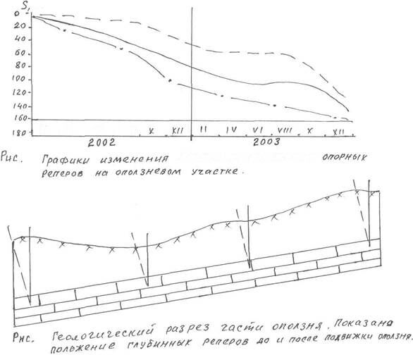 4. Систематические инструментальные наблюдения за плановым и высотным положением поверхностных реперов, установленных на небольшой глубине в приповерхностных горизонтах горных пород. Опорные репера образуют наблюдательную сеть. Результаты наблюдений изображают в виде разных графиков и разрезов дающих оценку устойчивости склонов и откосов, скорости и масштаб их деформации.