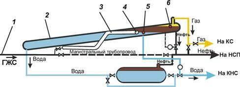 Рис.15. Принципиальная схема установки путевого сброса воды:1- нефтегазопровод, 2- трубный разделитель, 3- успокоительный коллектор, 4- вход успокоительного коллектора в трубный разделитель, 5-6 - датчики уровня, 7- отстойник воды
