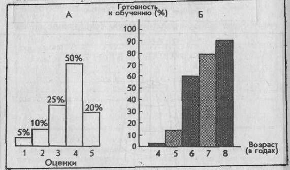 Рис. 78. Виды гистограмм на плоскости. А – гистограмма распределения оценок в классе. Б – гистограмма распределения показателей готовности детей разного возраста к обучению в школе.