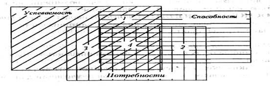 Таким образом, в зоне 1 находятся общие признаки проявлений способностей и успеваемости, в зоне 2 - способностей и потребностей, в зоне 3 - успеваемости и потребностей. Наконец, в зоне 4 присутствуют признаки, объединенные неким общим фактором для успеваемости, потребностей и способностей.