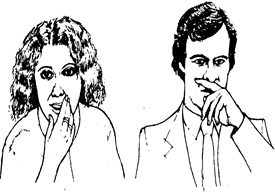 рукой" подскажет родителям о том, что ребенок солгал, но на протяжении всей своей жизни человек использует этот жест, когда он лжет, обычно меняется только скорость совершения этого жеста. Когда подросток говорит неправду, рука прикрывает рот почти так же, как и у пятилетнего ребенка, но только пальцы слегка обводят линию губ (рис.5). Это жест прикрывания рукой рта становится более утонченным во взрослом возрасте. Когда взрослый человек лжет, его мозг посылает ему импульс прикрыть рот, в попытке задержать слова обмана, как это делается пятилетним ребенком или подростком, но в последний момент рука уклоняется ото рта и рождается другой жест-прикосновение к носу (рис.6). Такой жест есть ни что иное, как усовершенствованный взрослый вариант того же жеста прикрывания рта рукой, который присутствовал в детстве. Это пример того, что с возрастом жесты людей становятся менее броскими и более завуалированными, поэтому всегда труднее считать ин­формацию 50-летнего человека, чем молодого.