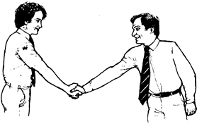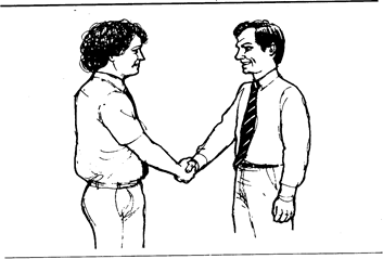 В таком случае руки собеседников встречаются на нейтральной территории. Люди, выросшие в районном городе, где плотность населения невысокая, могут иметь "воздушную оболочку" до 1,2 метра в радиусе или более, и именно на этом расстоянии находится кисть руки от тела, когда сельские жители здороваются за руку (рис.11). Сельские жители обычно стоят прочно на земле и наклоняются навстречу вашему рукопожатию, в то время как городской житель сделает шаг вперед при рукопожатии. Люди, выросшие в отдаленных или малонаселенных сельских районах, обычно имеют очень большие потребности в личном пространстве, достигающем 9 метров. Эти Люди предпочитают не здороваться за руку, а лучше на расстоянии помахать друг другу рукой (рис. 12).