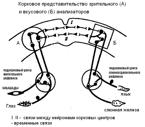 Если такое сочетание одновременного повышения возбудимости нейронов повторяется неоднократно, да еще и подкрепляется приятным ощущением – вкус пищи (или неприятным) – между нейронами образуется связь, которая называется временной. Эта связь будет существовать столько времени, сколько воздействие индифферентного раздражителя будет сопровождаться подкреплением.