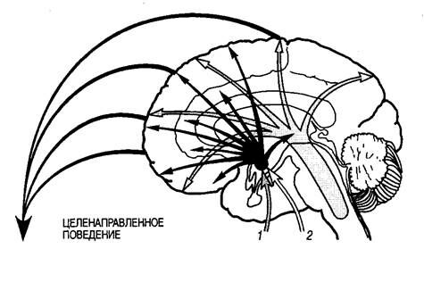 Рисунок 2. Пример вовлечения коры головного мозга при возникновении мотивации: активирующие влияния гипоталамических центров (черные) и ретикулярной формации (серые) на кору больших полушарий. 1 и 2 – потоки информации, поступающие к гипоталамусу гуморальным и нервным путем.