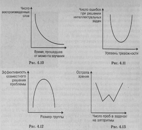 Инвертированная U-образная зависимость получается в многочисленных экспериментальных и корреляционных исследованиях как в психологии личности, мотивации, так и в социальной психологии (см. рис. 4.12).